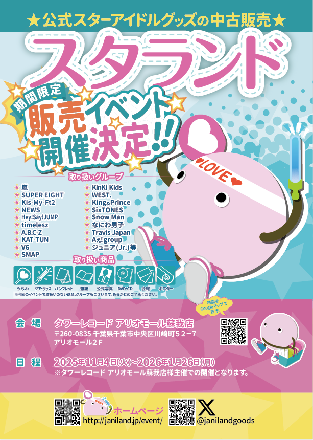 期間限定のイベント催事、YouTube、情報サイトなどでジャニランドの名前を知ってくれたあなた!ぜひ、ジャニランド直営店にお越しください!
