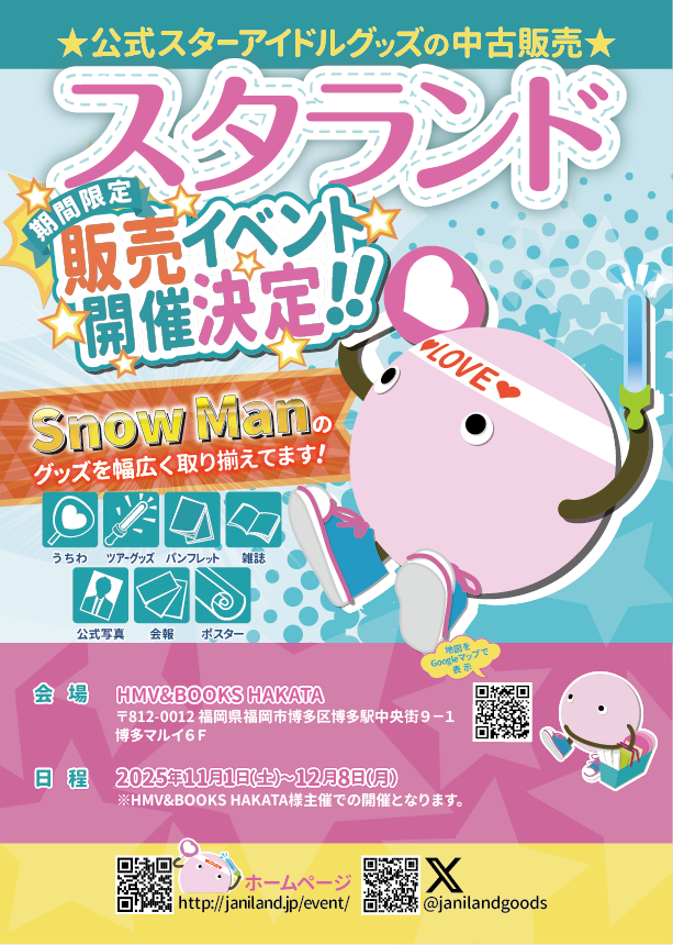 期間限定のイベント催事、YouTube、情報サイトなどでジャニランドの名前を知ってくれたあなた!ぜひ、ジャニランド直営店にお越しください!
