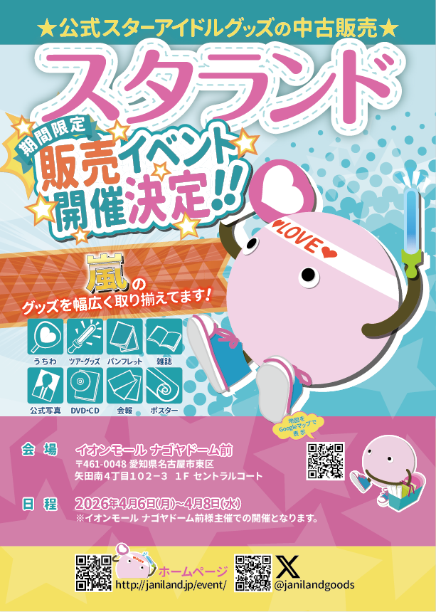 期間限定のイベント催事、YouTube、情報サイトなどでジャニランドの名前を知ってくれたあなた!ぜひ、ジャニランド直営店にお越しください!