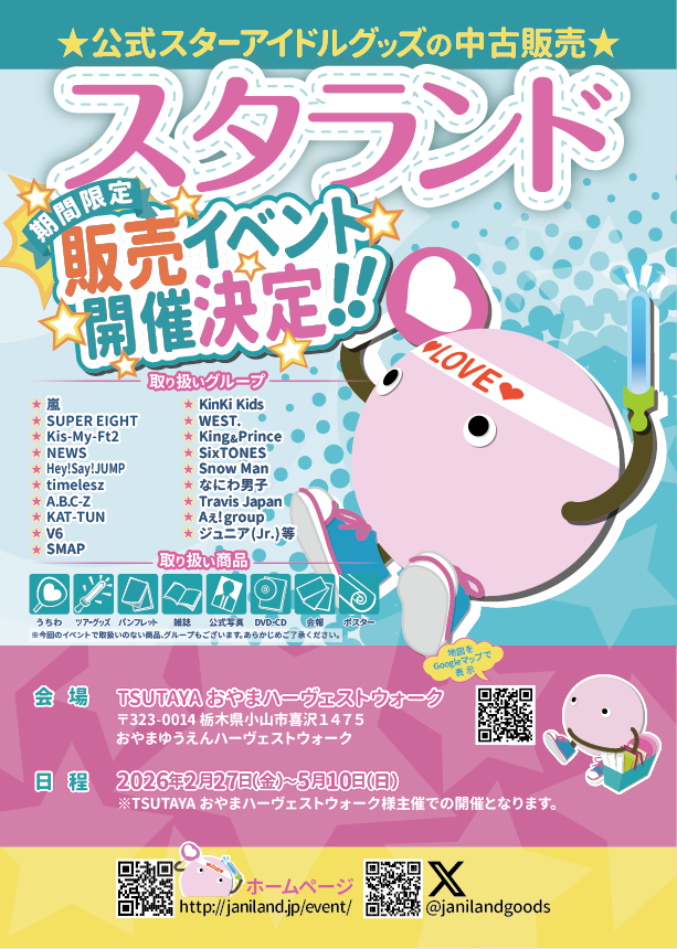 TSUTAYA おやまハーヴェストウォーク(栃木県小山市)でのジャニーズグッズ販売イベントが決定いたしました♪