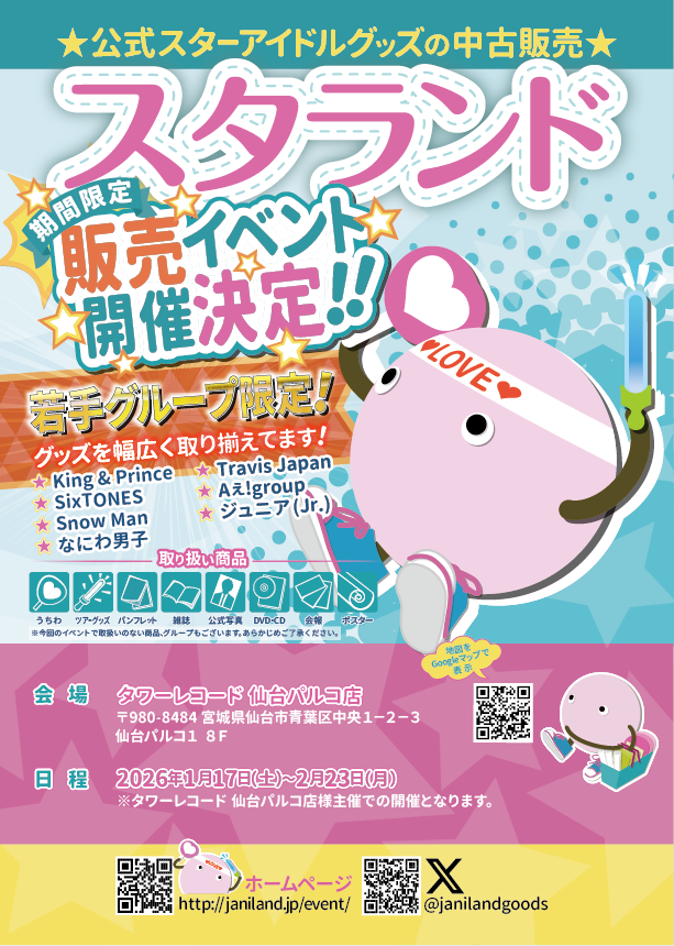期間限定のイベント催事、YouTube、情報サイトなどでジャニランドの名前を知ってくれたあなた!ぜひ、ジャニランド直営店にお越しください!