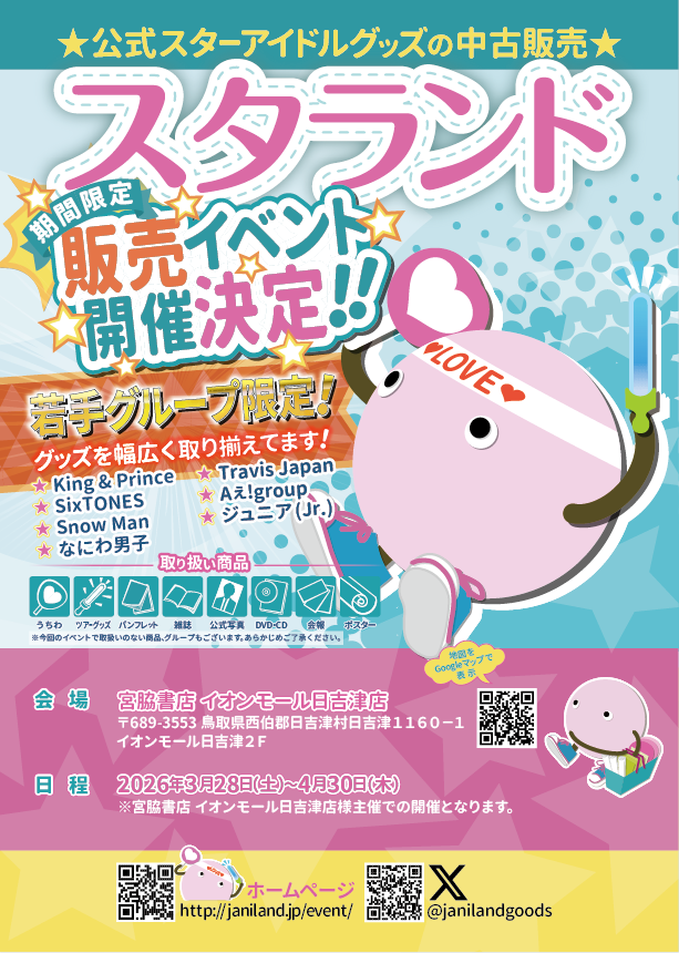 宮脇書店 イオンモール日吉津店(鳥取県西伯郡)でのジャニーズグッズ&K-POPグッズの販売イベントが決定いたしました♪