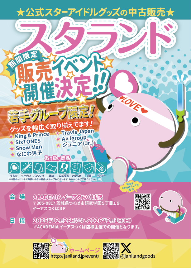 ACADEMIA イーアスつくば店(茨城県つくば市)でのジャニーズグッズ&K-POPグッズの販売イベントが決定いたしました♪